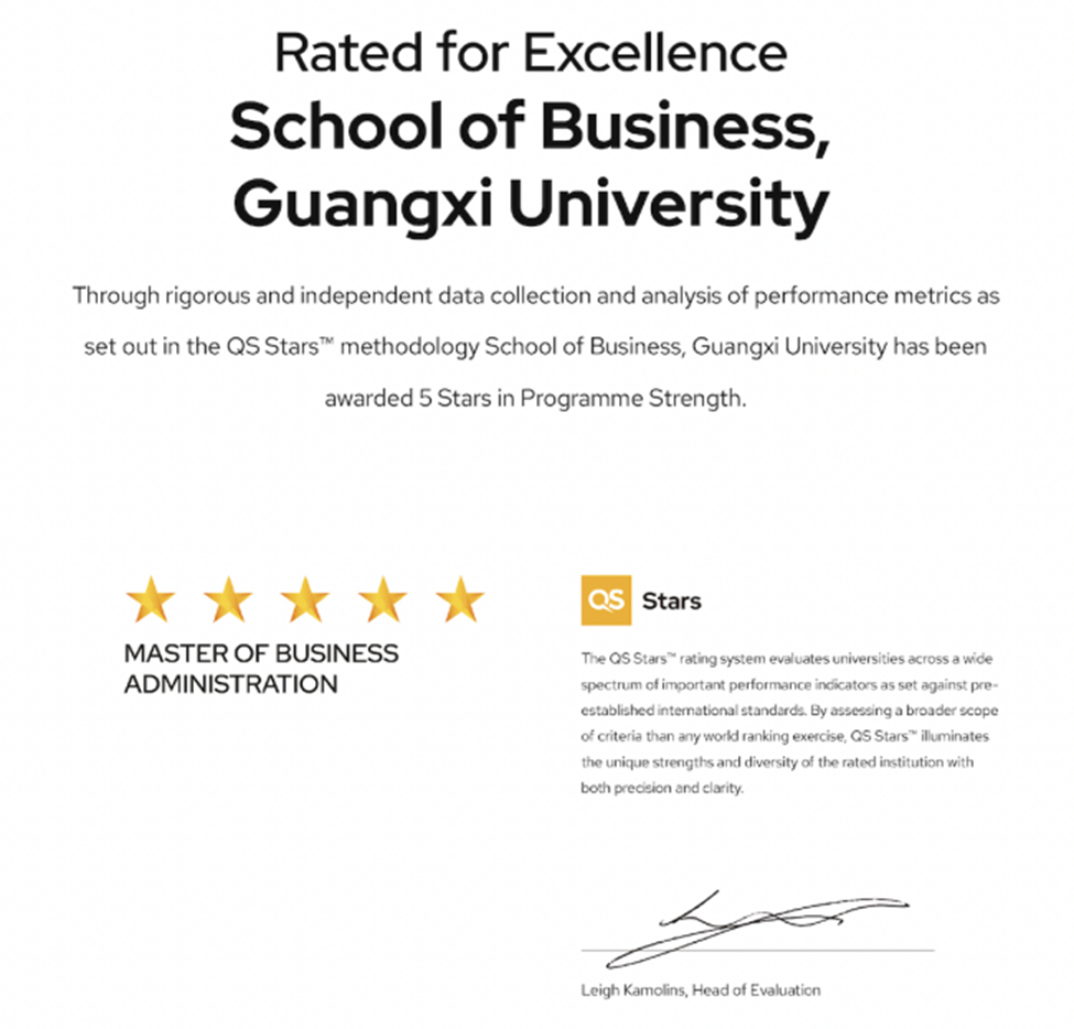 កម្មវិធី MBA នៃមហាវិទ្យាល័យ គ្រប់គ្រងធុរកិច្ច GXU បានទទួលការវាយតម្លៃផ្កាយប្រាំដោយ QS Stars International Certification