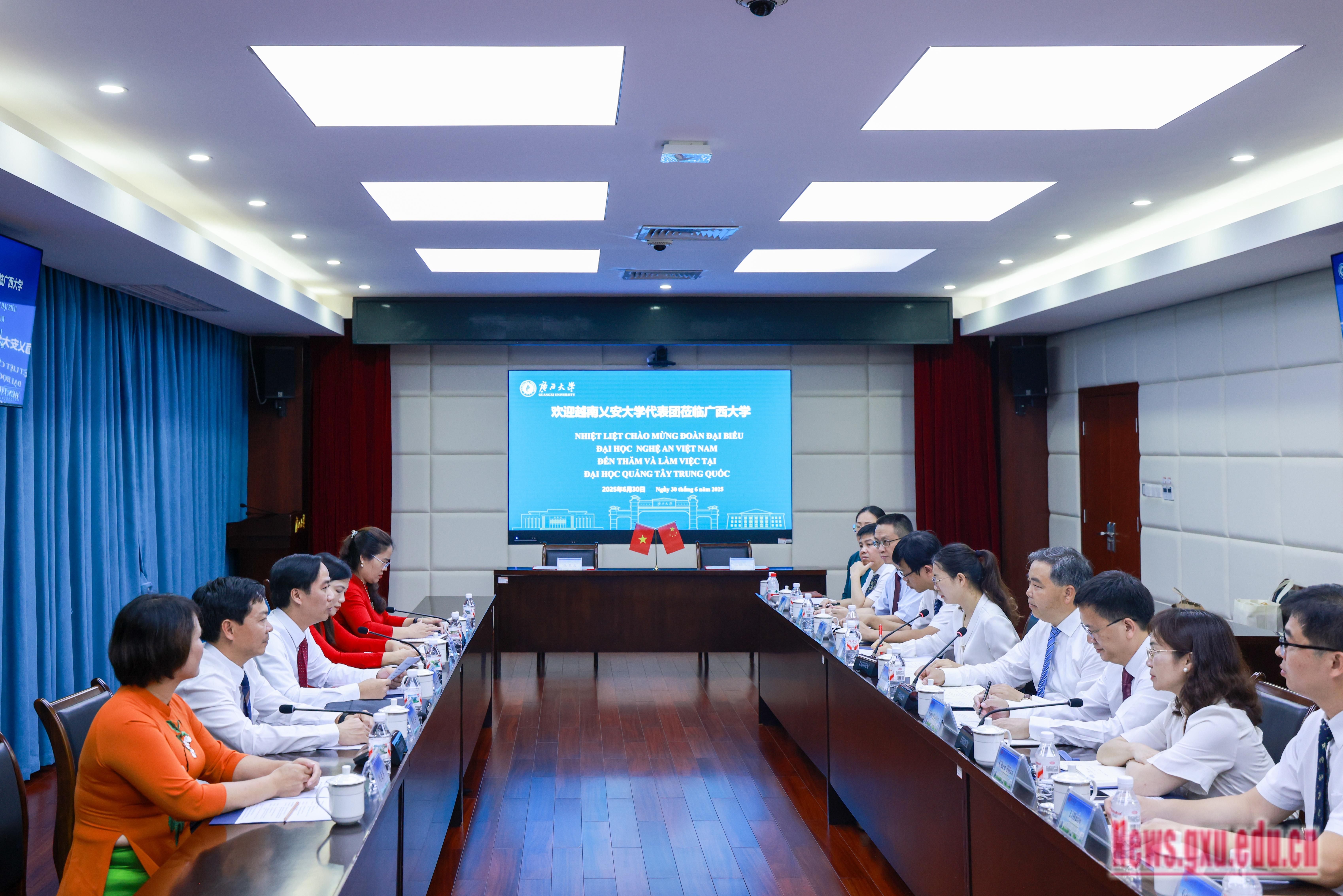 Pada 30 Jun 2025, Presiden Universiti NGHE AN, Vietnam, Nguyen Ngoc Hieu mengetuai delegasi ke Universiti Guangxi. Li Guozhong, Setiausaha Jawatankuasa CPC GXU, bertemu dengan para tetamu. Xiao Jianzhuang, Naib Presiden, mempengerusikan simposium itu.Li Guozhong berkata bahawa tahun ini menandakan ulang tahun ke-75 penubuhan hubungan diplomatik antara China dan Vietnam, serta Tahun Pertukaran A...