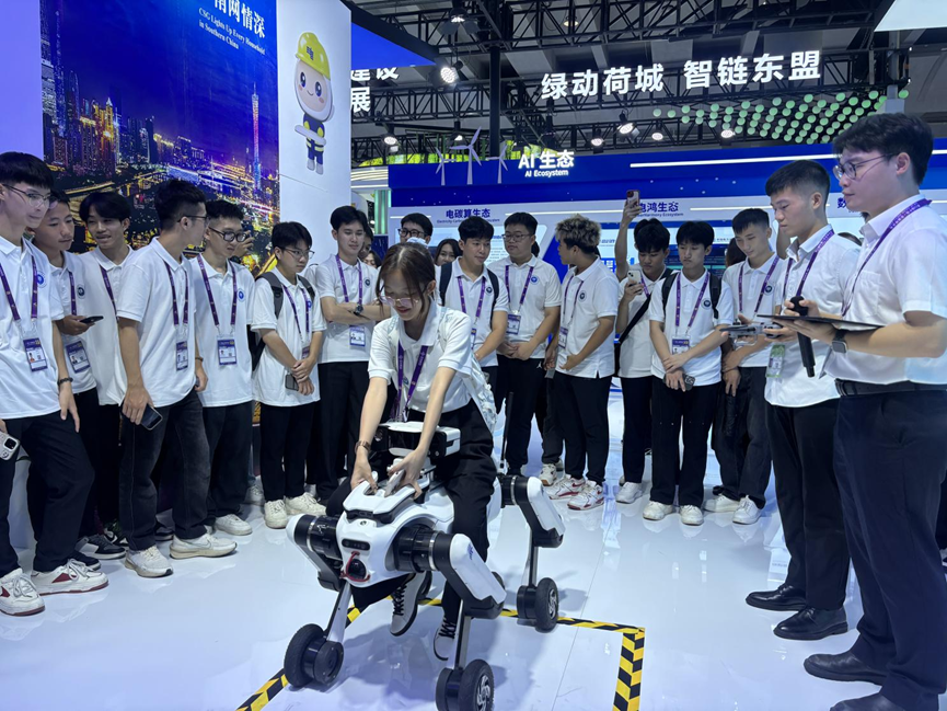 i dan Syarikat China Huadian, menjadikan ini satu permulaan yang unik dan penuh inspirasi bagi perjalanan akademik mereka. Li Yan, pakar teknikal kanan dari Biro Bekalan Kuasa Nanning, berkongsi pengalamannya berkembang menjadi juruteknik mahir. Bermula daripada asas sistem grid kuasa, beliau memperkenalkan pencapaian dan aplikasi terbaharu dalam sektor “AI + Grid Kuasa Pintar” yang dibangunkan oleh Syarikat Grid Kuasa Selatan China. Dalam sesi interaktif, para pelajar menyaksikan robot terjelma dan “anjing robot” mempamerkan keupayaan mereka dalam penyelenggaraan litar dan diagnosis kerosakan. Persembahan mengagumkan teknologi-teknologi ini menimbulkan rasa teruja dan harapan tinggi terhadap masa depan grid kuasa pintar.