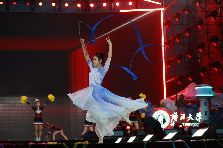 Tokoh terkenal seperti Hu Yanbin, JA Fu Longfei, R.E.D, Wang Aonan EVE, dan Yang Huaju telah dijemput membuat persembahan di pentas bersama pelajar Universiti Guangxi, sekali gus terus menaikkan kemeriahan suasana. Persembahan seni budaya etnik seperti “Cai Diao · Bronze Bird Forest”, “Song of the Earth”, dan “Dong Ethnic Chorus”, yang dibimbing dengan teliti oleh tenaga pengajar dari Sekolah Seni universiti, turut dipersembahkan dengan cemerlang. Persembahan-persembahan ini mewarisi warisan budaya Guangxi melalui ekspresi belia, dan secara nyata memperlihatkan pencapaian kukuh GXU dalam pendidikan estetika serta pemeliharaan dan pewarisan budaya tradisional unggul.