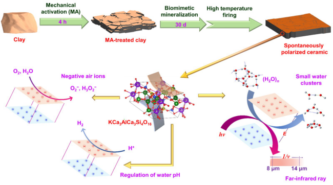 ແຮງບັນດານໃຈຈາກແຮ່ທາດຊີວະພາບທາງທະເລ, ທີມງານຄົ້ນຄ້ວາໄດ້ຮັບຮອງເອົາລະບົບປະຕິກິລິຍາໄລຍະແຂງຂອງກົນຈັກທີ່ພັດທະນາດ້ວຍຕົນເອງເພື່ອກະຕຸ້ນແລະ pretreat ວັດຖຸດິບດິນເຜົາ, ຜະລິດ ຊິລິໂຄນທີ່ມີໂຄງສ້າງຜລຶກ polyhedral ສະເພາະໂດຍຜ່ານການຂຸດຄົ້ນແຮ່ທາດ ໄບໂອນິກ, ແລະສ້າງຮູບແບບແຮ່ທາດ silicate ທີ່ມີໂຄງສ້າງວົງແຫວນໂດຍຜ່ານການຮັກສາອຸນຫະພູມສູງ, ດັ່ງນັ້ນເຄື່ອງປັ້ນດິນເຜົາ Nixing ສຸດທ້າຍມີຄຸນສົມບັດພິເສດຂອງເຄື່ອງປັ້ນດິນເຜົາ frared ເຊັ່ນ: ໄຟຟ້າ. ການປ່ອຍອາຍພິດ. ຜົນກະທົບຂອງ Polarization ຕົນເອງຂອງເຄື່ອງປັ້ນດິນເຜົາ Nixing ກັບຫນ້າທີ່ລະບົບນິເວດສາມາດເຮັດໃຫ້ເກີດການສ້າງຕັ້ງຂອງ ໄຟຟ້າຖາວອນແລະພາກສະຫນາມໄຟຟ້າດ້ານ. ຄວາມແຕກຕ່າງທີ່ມີທ່າແຮງລະຫວ່າງສອງປາຍຂອງໄປເຊຍກັນ ionizes ອາກາດອ້ອມຂ້າງ, ແລະເອເລັກໂຕຣນິກທີ່ຖືກກະທົບຕິດກັບໂມເລກຸນນ້ໍາແລະອົກຊີເຈນທີ່ຕິດກັນ, ເຊິ່ງສາມາດກະຕຸ້ນອາກາດ. ເມື່ອເຄື່ອງປັ້ນດິນເຜົາ Nixing ຖືນ້ໍາ, ມັນແຍກ ອອກຈາກກັນໂມເລກຸນນ້ໍາແລະການປ່ຽນແປງສະຖານະ redox ຂອງນ້ໍາແລະປັບຄ່າ pH. ຢູ່ທີ່ 7, ມັນຖືກຫຼຸດລົງເພື່ອປ່ອຍ hydrogen ແລະປະກອບເປັນນ້ໍາທີ່ມີ hydrogen. ແສງອິນຟາເຣດທີ່ປ່ອຍອອກມານັ້ນຈະສະທ້ອນກັບໂມເລກຸນຂອງນ້ຳ, ທຳລາຍຄວາມຜູກພັນຂອງທາດໄຮໂດເຈນລະຫວ່າງໂມເລກຸນນ້ຳ, ເຮັດໃຫ້ກຸ່ມໂມເລກຸນນ້ຳມີຂະໜາດນ້ອຍລົງ ແລະ ປະກອບເປັນກຸ່ມນ້ຳໂມເລກຸນຂະໜາດນ້ອຍ, ເຊິ່ງມີຜົນຕໍ່ການກະຕຸ້ນນ້ຳ.