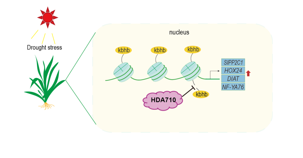 The study also explored how Kbhb modification itself is regulated during drought stress. Through screening for regulatory factors associated with Kbhb, the researchers identified the histone deacetylase HDA710 as a specific enzyme capable of removing Kbhb marks from histones. Both in vivo and in vitro biochemical experiments confirmed that HDA710 acts as a key negative regulator of this modification. Under drought conditions, loss of HDA710 function leads to the accumulation of Kbhb marks at drought-responsive gene loci, promoting transcriptional activation and ultimately enhancing the plant’s drought resistance.