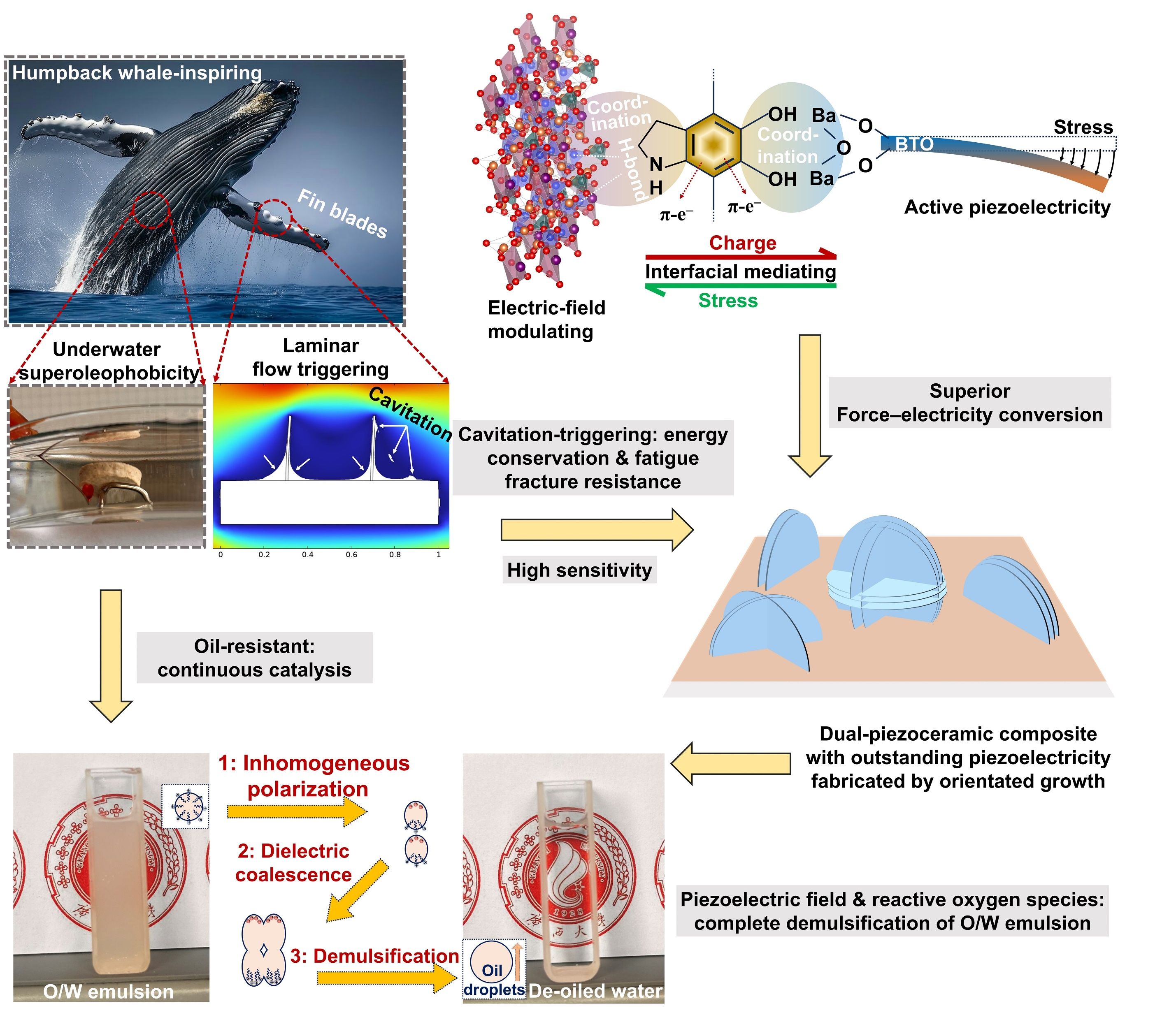 Safe and sustainable piezocatalytic technology holds broad application prospects in the field of water purification. However, the inherent rigidity of piezoceramics makes achieving excellent piezocatalytic efficiency quite challenging, as the process typically requires substantial energy consumption and presents a risk of fatigue fracture in the piezoceramics. To address this, the team drew inspiration from the irregular nodules on the leading edge of a humpback whale's pectoral flippers, which create cavitation effects and flow vortices in turbulent water. Using eco-functional Nixing Pottery, which possesses spontaneous polarization properties, as the base material, they synthesized a super-wetting dual-piezoelectric composite material with high force-electric sensitivity. This was achieved by directionally growing barium titanate after biomimetic modification with polydopamine. Under gentle mechanical force triggering, this biomimetic composite material generated a key cavitation effect. The coordination action of polydopamine enabled efficient stress and charge transfer between the eco-functional Nixing Pottery and barium titanate. Consequently, the composite material exhibited an excellent piezoelectric response, generating a localized piezoelectric field of 1.46×10V/m and reactive oxygen species, thereby avoiding fatigue fracture and high energy consumption. Using ordinary stirring as the mechanical force, the material achieved complete demulsification of an oil-in-water emulsion within 15 minutes through electric field polarization of oil droplets and degradation of the emulsifier by reactive oxygen species, demonstrating a performance 3.3 to 4.0 times superior to comparative catalysts. This strategy enables sustainable and efficient demulsification, showing significant application potential for the large-scale purification treatment of oily wastewater.