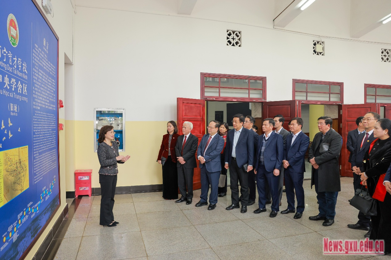 ທີ່ຫໍປະຊຸມໃຫຍ່ຂອງມະຫາວິທະຍາໄລກວາງຊີ (ເຊິ່ງເຄີຍເປັນອາຄານຫ້ອງຮຽນຂອງໂຮງຮຽນໜານໜິງຢູຊາຍ), ຄະນະຜູ້ແທນໄດ້ຮັບຟັງການແນະນຳກ່ຽວກັບປະຫວັດສາດຂອງສະຖາບັນ ແລະ ໄດ້ຊົມງານວາງສະແດງຮູບພາບທີ່ມີຫົວຂໍ້ວ່າ "ສາຍພົວພັນຢູຊາຍ, ພັນທະໄມຕີລະຫວ່າງຈີນ-ຫວຽດນາມ." ເຂົາເຈົ້າໄດ້ຮັບຄວາມເຂົ້າໃຈຢ່າງເລິກເຊິ່ງກ່ຽວກັບການແລກປ່ຽນດ້ານການສຶກສາຂອງມະຫາວິທະຍາໄລກວາງຊີກັບຫວຽດນາມໃນຍຸກໃໝ່ ແລະ ຜົນສຳເລັດການຮ່ວມມືທີ່ບັນລຸໄດ້. ຄະນະຜູ້ແທນໄດ້ຍ້ອງຍໍຊົມເຊີຍການປະກອບສ່ວນທາງປະຫວັດສາດຂອງໂຮງຮຽນໜານໜິງຢູຊາຍໃນການຝຶກອົບຮົມບຸກຄະລາກອນປະຕິວັດ ແລະ ສ້າງຊາດຈຳນວນຫຼວງຫຼາຍໃຫ້ແກ່ຫວຽດນາມ. ເຂົາເຈົ້າໄດ້ຮັບຮູ້ຢ່າງເຕັມທີ່ຕໍ່ຄວາມພະຍາຍາມຂອງມະຫາວິທະຍາໄລກວາງຊີໃນການສົ່ງເສີມມໍລະດົກທາງປະຫວັດສາດອັນເລິກເຊິ່ງຂອງ "ສາຍພົວພັນຢູຊາຍ, ພັນທະໄມຕີລະຫວ່າງຈີນ-ຫວຽດນາມ" ແລະ ຜົນໄດ້ຮັບທີ່ມີຜົນສຳເລັດໃນການແລກປ່ຽນດ້ານການສຶກສາ ແລະ ການຮ່ວມມືກັບຫວຽດນາມ. ຄະນະຜູ້ແທນໄດ້ສະແດງຄວາມຫວັງສຳລັບການເພີ່ມທະວີການຮ່ວມມືກັບມະຫາວິທະຍາໄລກວາງຊີຢ່າງຕໍ່ເນື່ອງໃນຂົງເຂດຕ່າງໆເຊັ່ນ: ການປູກຝັງພອນສະຫວັນ ແລະ ການແລກປ່ຽນຊາວໜຸ່ມ, ແລະ ໄດ້ເຊື້ອເຊີນຢ່າງຈິງໃຈໃຫ້ຜູ້ນຳມະຫາວິທະຍາໄລນຳພາຄະນະຜູ້ແທນມາຢ້ຽມຢາມຫວຽດນາມ.