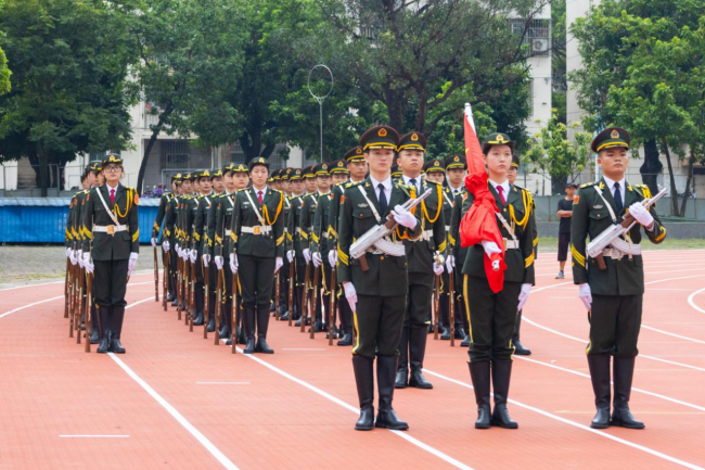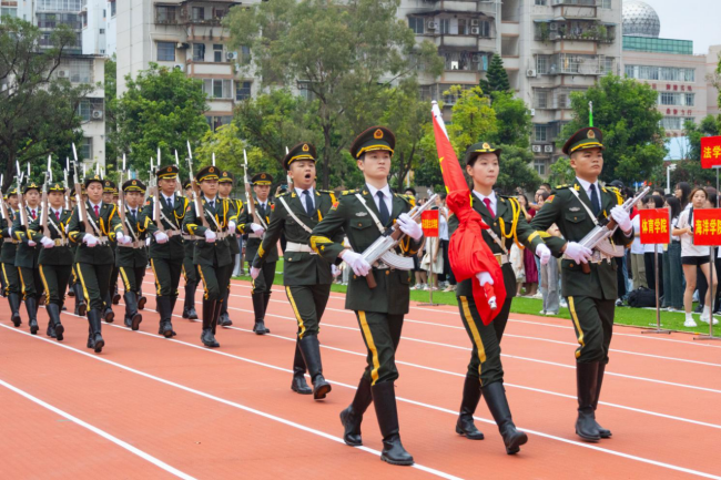ເວລາ 8:00 ໂມງ, ພິທີຊັກທຸງໄດ້ເລີ່ມຂຶ້ນຢ່າງເປັນທາງການ. ບັນດາເຈົ້າໜ້າທີ່ຮັກສາທຸງຊາດໄດ້ພາກັນເດີນຂະບວນຢ່າງມີພະລັງ, ໄດ້ພາທຸງສີແດງຫ້າດາວໄປຫາເສົາທຸງ. ຫຼັງຈາກນັ້ນ, ຜູ້ຖືທຸງຊາດໄດ້ຍົກທຸງສີແດງຫ້າດາວຢູ່ໃນມືຂອງລາວ, ແລະທຸງຊາດສີແດງສົດໃສໄດ້ລຸກຂຶ້ນຊ້າໆ, ກະພິບໃນລົມແລະແສງສະຫວ່າງໃນຕອນເຊົ້າ. ສຽງ ມີນາຂອງອາສາສະໝັກ ດັງກ້ອງກັງວານໄປທົ່ວວິທະຍາເຂດ, ແລະ ບັນດາຄະນະວິຊາ ແລະ ນັກສຶກສາທັງໝົດໄດ້ຢືນຢູ່ຕໍ່ໜ້າທຸງຊາດຢ່າງສະຫງ່າຜ່າເຜີຍ, ສາຍຕາຂອງເຂົາເຫຼື້ອມໃສໃນຂະນະທີ່ເຂົາເຈົ້າຮ້ອງເພງແຫ່ງຊາດຮ່ວມກັນ.