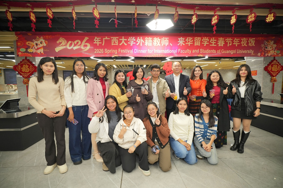 កាលពីថ្ងៃទី 12 ខែកុម្ភៈ សាកលវិទ្យាល័យ Guangxi បានប្រារព្ធពិធីជួបជុំគ្នានៅពិធីបុណ្យនិទាឃរដូវឆ្នាំ 2026 សម្រាប់សមាជិកមហាវិទ្យាល័យ និងនិស្សិតអន្តរជាតិ។ អនុប្រធានាធិបតី Yu Wenjin បានចូលរួមក្នុងព្រឹត្តិការណ៍នេះ និងថ្លែងសុន្ទរកថា។