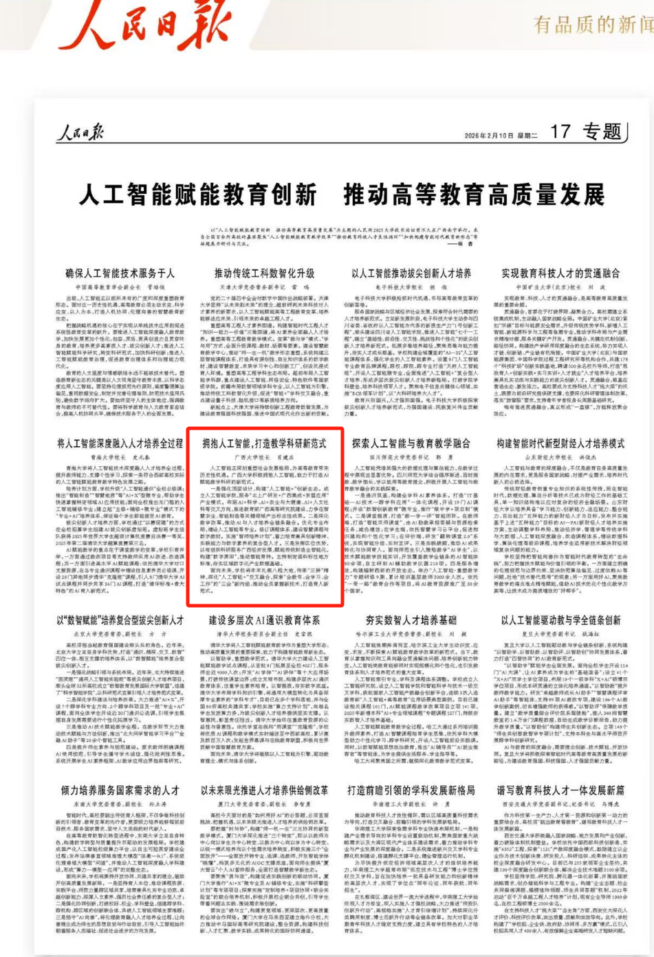 一是强化顶层设计,构建“人工智能+”创新生态。成立人工智能学院,服务“北上广研发+广西集成+东盟应用”产业模式。布局AI+科学、AI+农业与大健康、AI+人文社科等交叉方向,推进教育部广西高等研究院建设,力争在智慧农业、智能制造等关键领域产出标志性成果。二是深化教学改革,推动AI与人才培养全链条融合。优化专业布局,增设人工智能等专业。修订课程体系,建设智慧课程与数字教材。实施“智师培养计划”,着力培育兼具创新精神、实践能力与数字素养的复合型人才。三是发挥区位优势,以有组织科研服务广西经济发展,赋能传统制造业智能化,构建“数字蔗田”,推动智能育种。主持制定语料标注地方标准,夯实区域数字化产业数据基础。