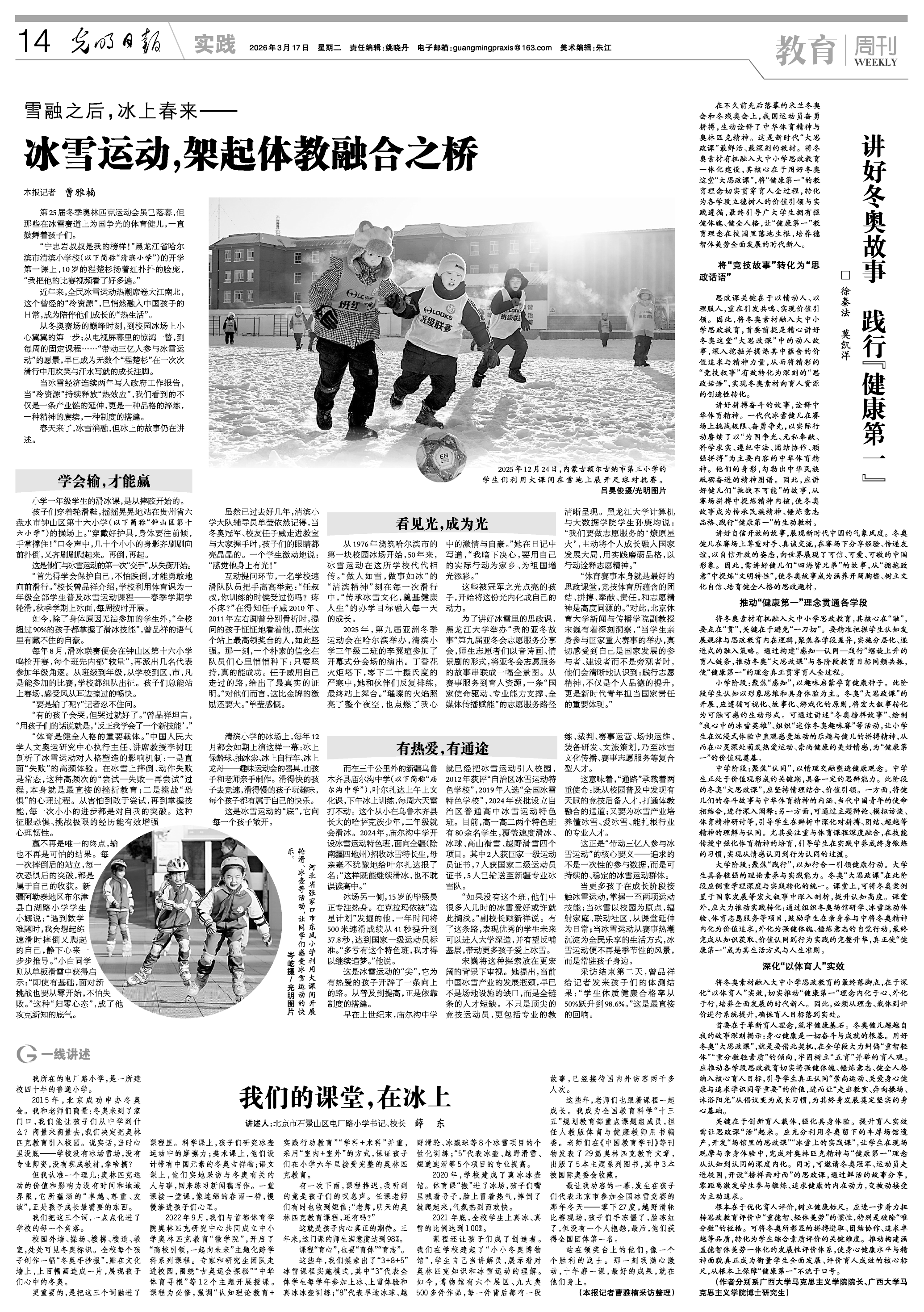 在不久前先后落幕的米兰冬奥会和冬残奥会上,我国运动员奋勇拼搏,生动诠释了中华体育精神与奥林匹克精神。这是新时代“大思政课”最鲜活、最深刻的教材。将冬奥素材有机融入大中小学思政教育一体化建设,其核心在于用好冬奥这堂“大思政课”,将“健康第一”的教育理念切实贯穿育人全过程,转化为各学段立德树人的价值引领与实践遵循,最终引导广大学生拥有强健体魄、健全人格,让“健康第一”教育理念在校园里落地生根,培养德智体美劳全面发展的时代新人。