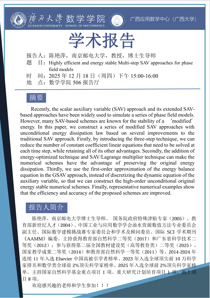 数学与信息科学学院学术报告:Highly efficient and energy stable Multi-step SAV approaches for phase field models