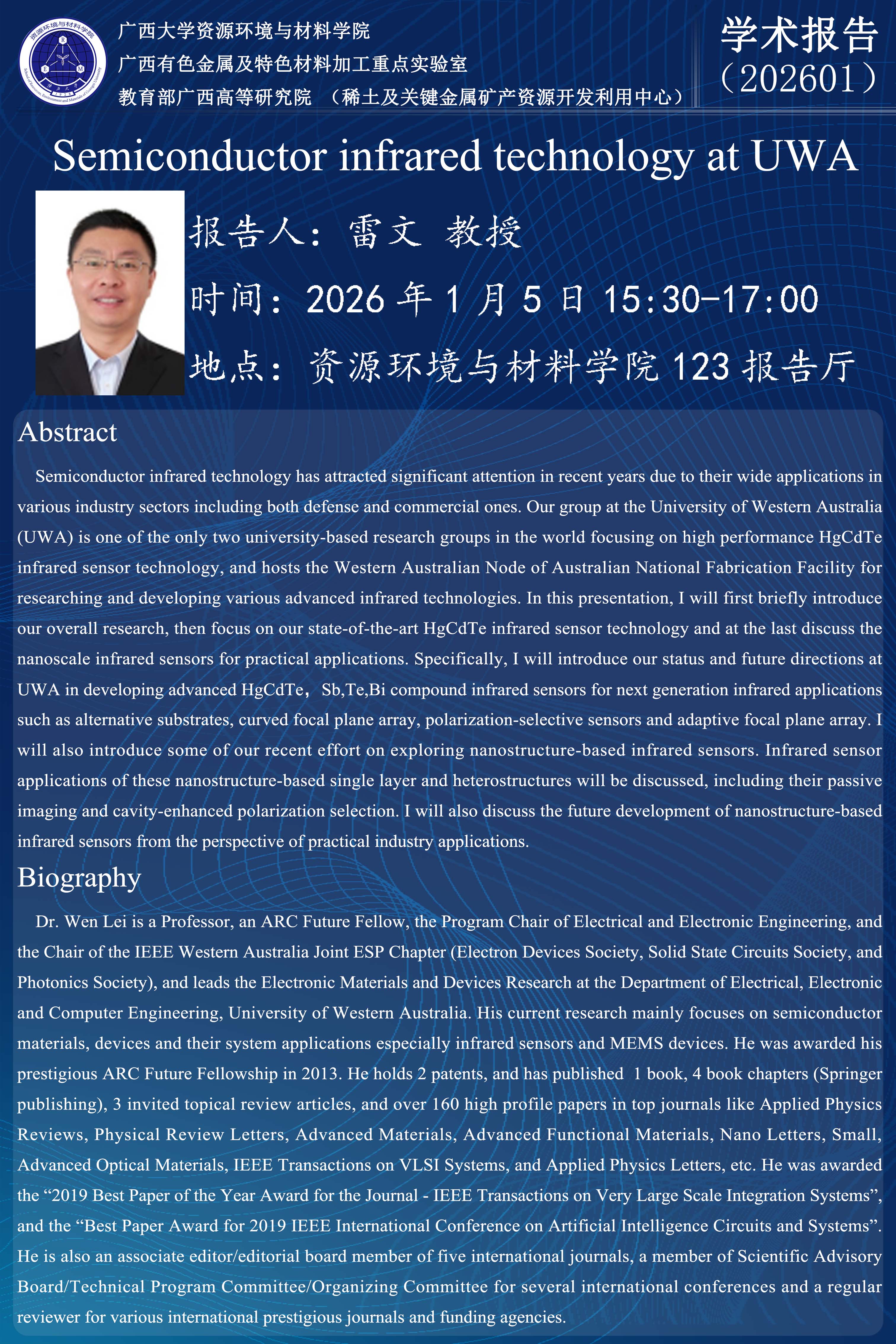 上一条:资源环境与材料学院学术报告:面向极端环境的六边形战士:超高温陶瓷(UHTC)聚合物先驱体研发与产业化突破