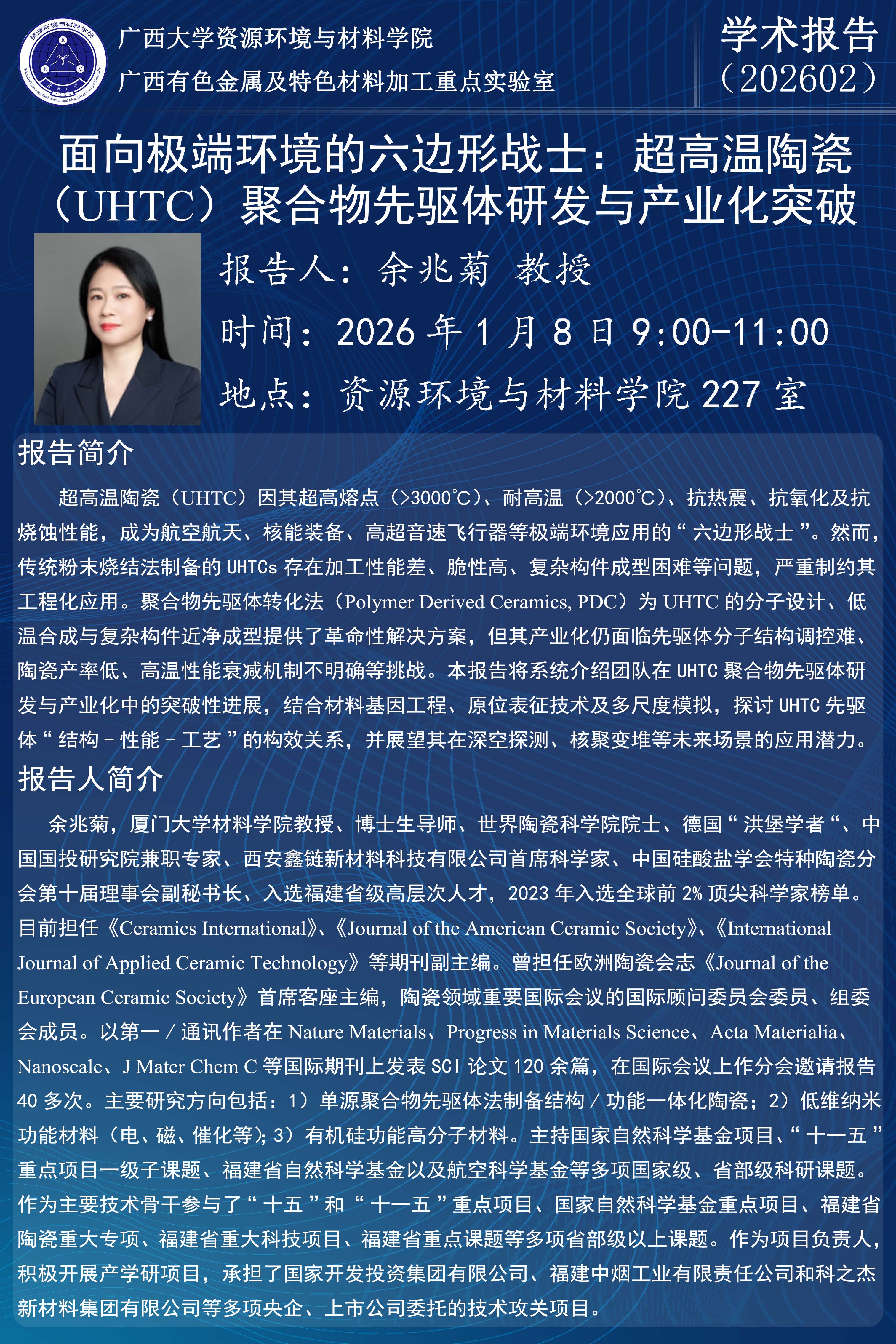 资源环境与材料学院学术报告:面向极端环境的六边形战士:超高温陶瓷(UHTC)聚合物先驱体研发与产业化突破