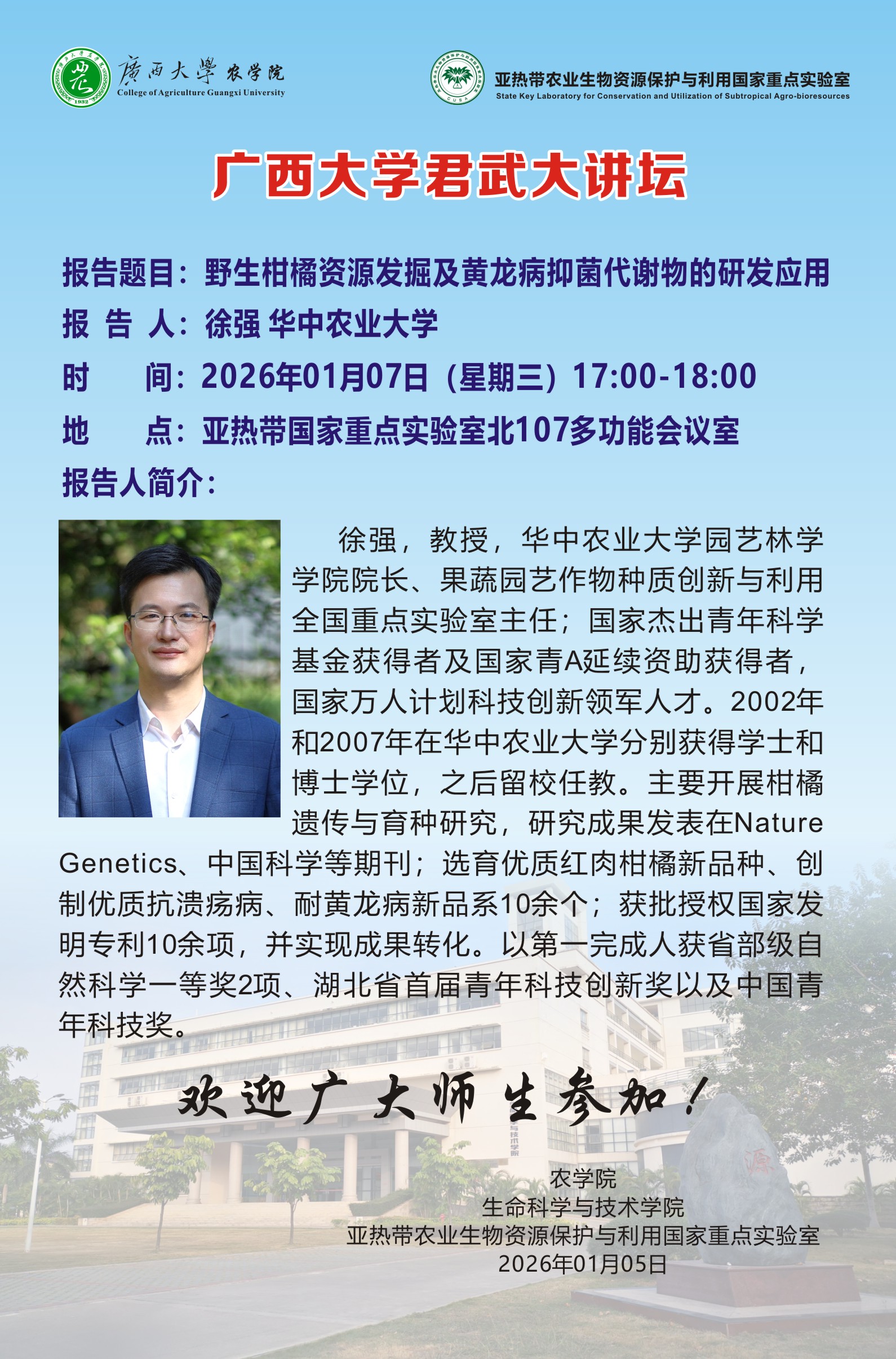 君武大讲坛、农学院何康大讲坛:野生柑橘资源发掘及黄龙病抑菌代谢物的研发应用